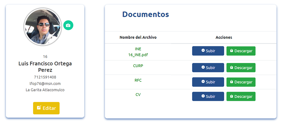 El Profesor ingresa sus datos personales, sube documentos para tener actualizado su expediente, fotgrafia actual.