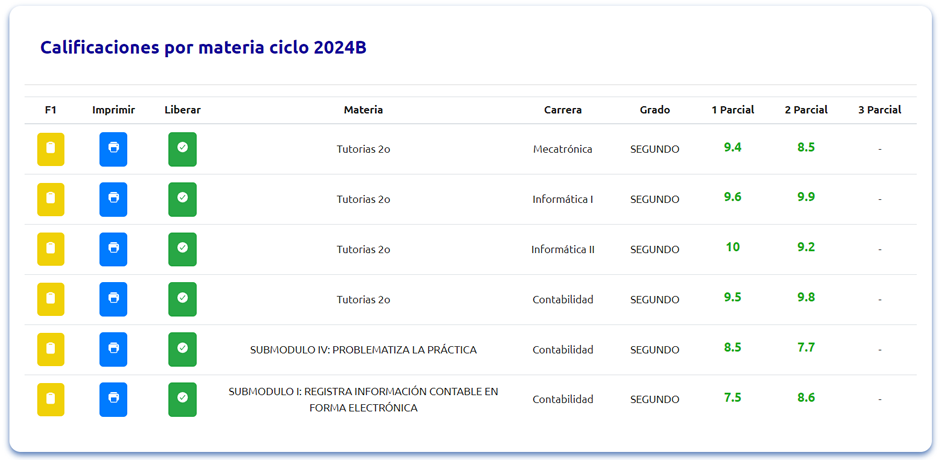 El profesor ingresa calificaciones[F1], imprime cuadros de calificaciones, libera calificaciones por materia y se muestra los promedios de cada una.